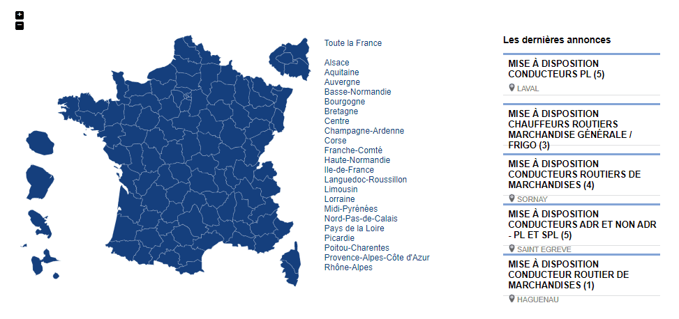 Parmi les annonces présentes sur le site on trouve la mise à disposition de chauffeurs SPL Frigo, Chauffeurs PL et Caristes, Conducteurs SPL, etc. L’ensemble des départements français sont concernés.