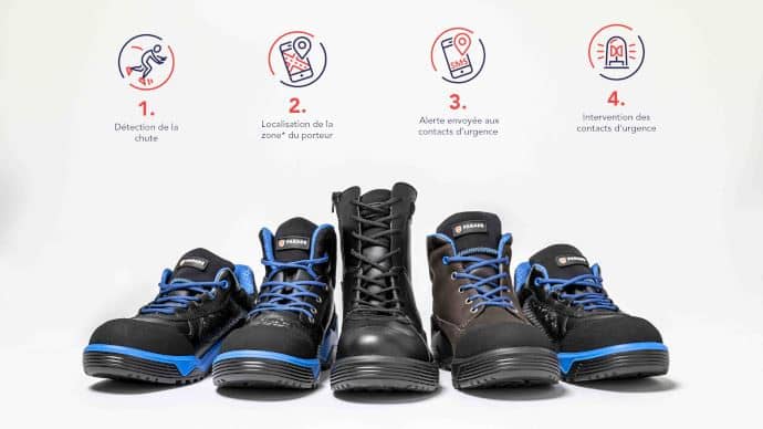 - Les chaussures connectées se montrent efficaces pour plus de sécurité. Elles sont capables d’envoyer une alerte en cas de chute lourde. Reliées à une application en temps réel, elles disposent d’un capteur de présence et d’un accéléromètre intégré. C’est le cas des chaussures de sécurité connectée de Parade avec localisation GPS. Elles détectent toute situation anormale et déclenchent automatiquement une alerte. Une solution qui s‘avère particulièrement utile pour la protection des travailleurs isolés.