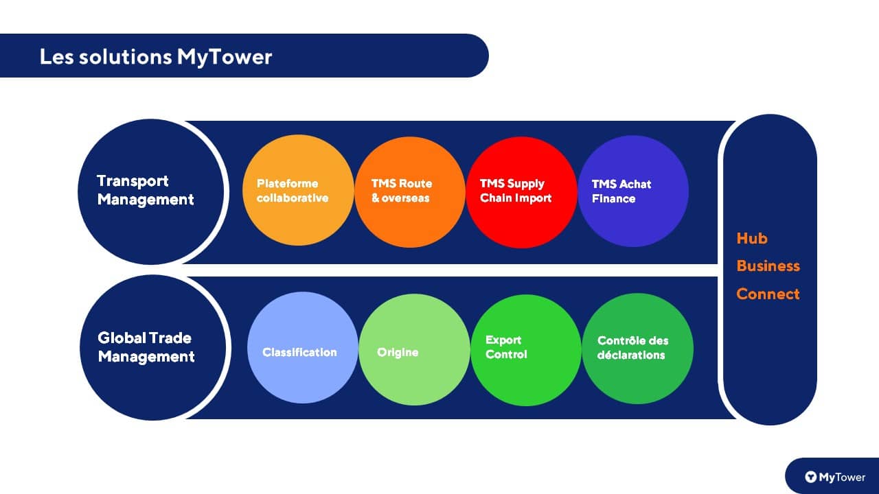 MyTower accompagne ses clients dans la digitalisation de leurs processus Transport et Commerce international, pour répondre à leurs objectifs stratégiques grâce à ses trois pôles d’activités : Solutions TMS (Transport Management System) et GTM (Global Trade Management) ; Professional Services pour vous accompagner dans le déploiement opérationnel de votre projet de digitalisation ; une équipe Consulting & Expertise qui a développée de vraies expertises à très forte valeur ajoutée sur les problématiques Douane et Trade Compliance. Découvrons ensemble tout ce qu’il faut savoir au sujet de MyTower et tous ses avantages pour votre entreprise !